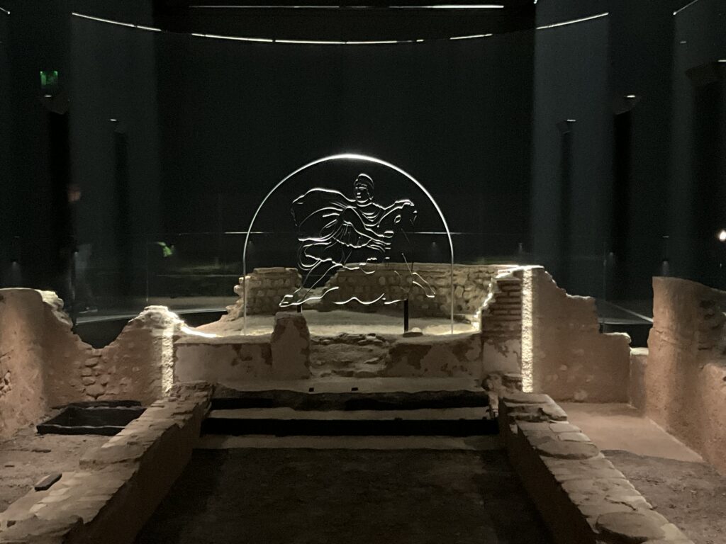 The first exhibition of the day was Jonathan Baldock’s ‘0.1%’ at the London Mithraeum Bloomberg Space. I did not know what to expect from this unusual gallery space as this was my first ever visit to the site. Situated in the City of London amongst contemporary office buildings, it houses the reconstructed remains of the Temple of Mithras (a faithful recreation of the ruin that was discovered in 1954 by archaeologist Professor W.F. Grimes during the excavations carried out following the Blitz in 1941). I arrived just as a tour of the temple was about to begin. The tour was more like an immersive experience involving theatrical lights and sound recordings of chanting, whispering and footsteps. The strange performative element, and the bizarre juxtaposition of this archaeological site amongst the glass-fronted financial buildings was already somewhat jarring, but Jonathan Baldock’s work then added another dimension to the experience.