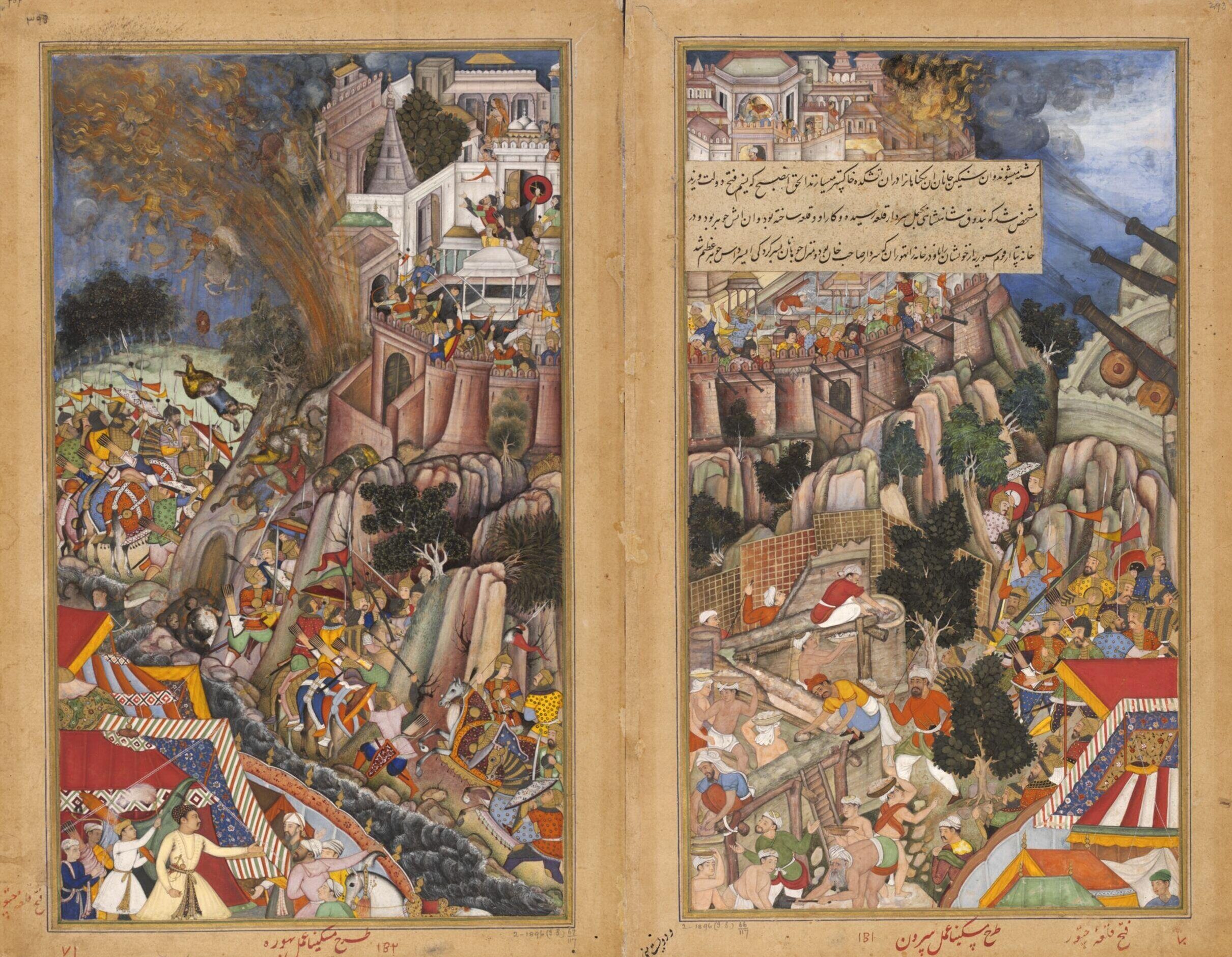 A factsheet resource on Akbarnama: Mines exploding during the siege of Chitor, by Miskina, Sarwan and Bhura. Image credit: Digital image courtesy of Victoria and Albert Museum, London.…